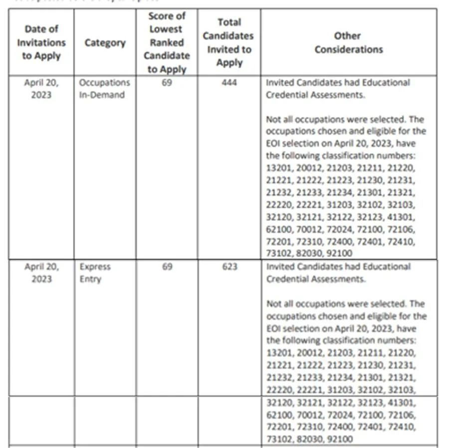 國際技術移民快速通道類別:邀請了623人,最低邀請分數69分。