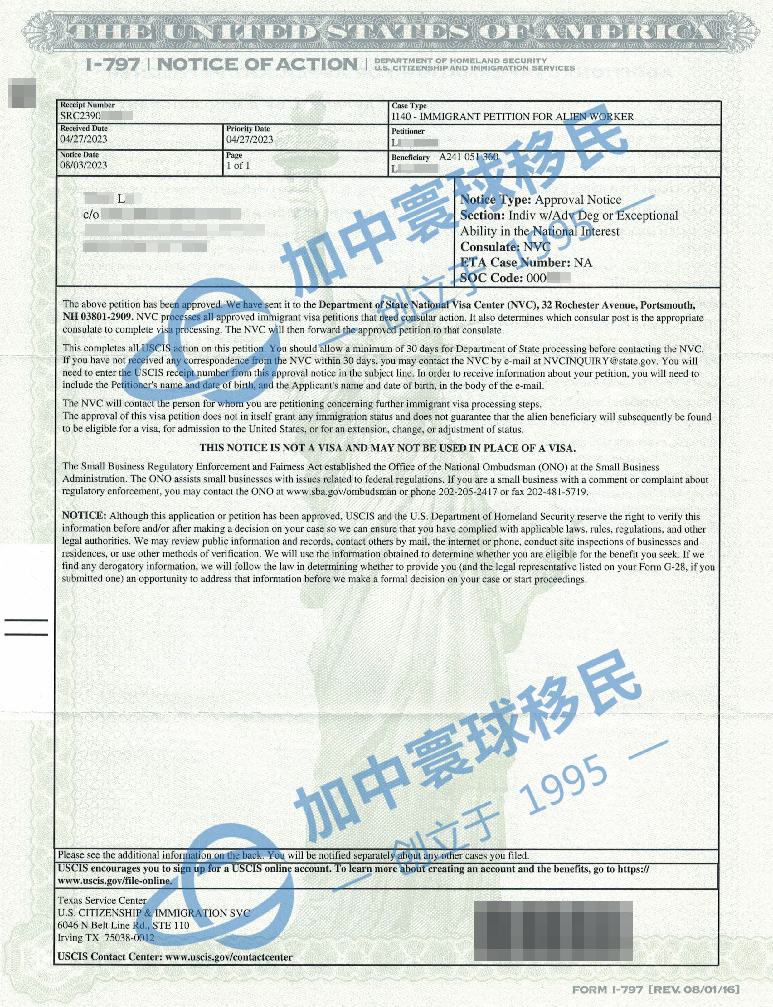 2023年8月3日, I-140獲批